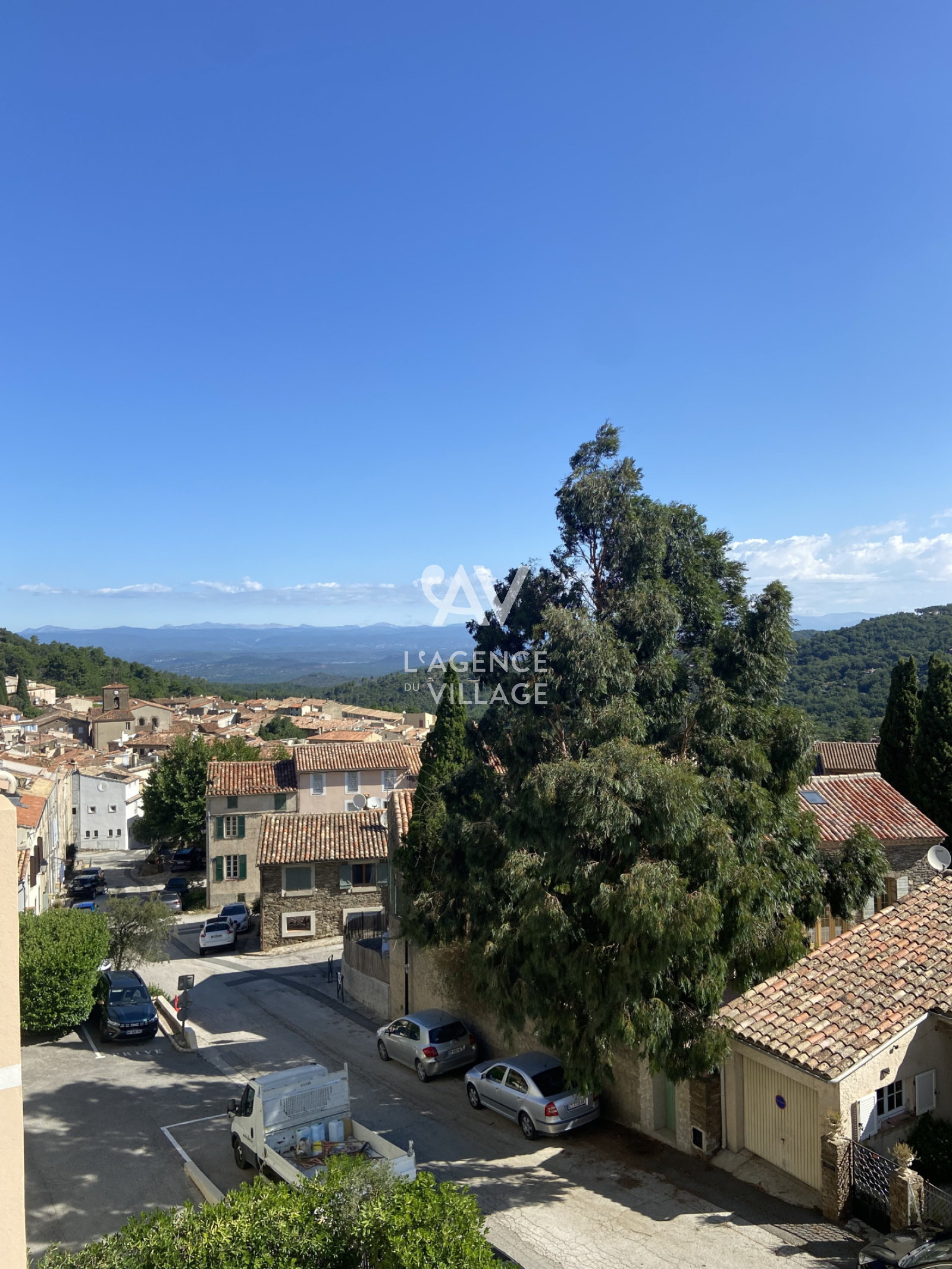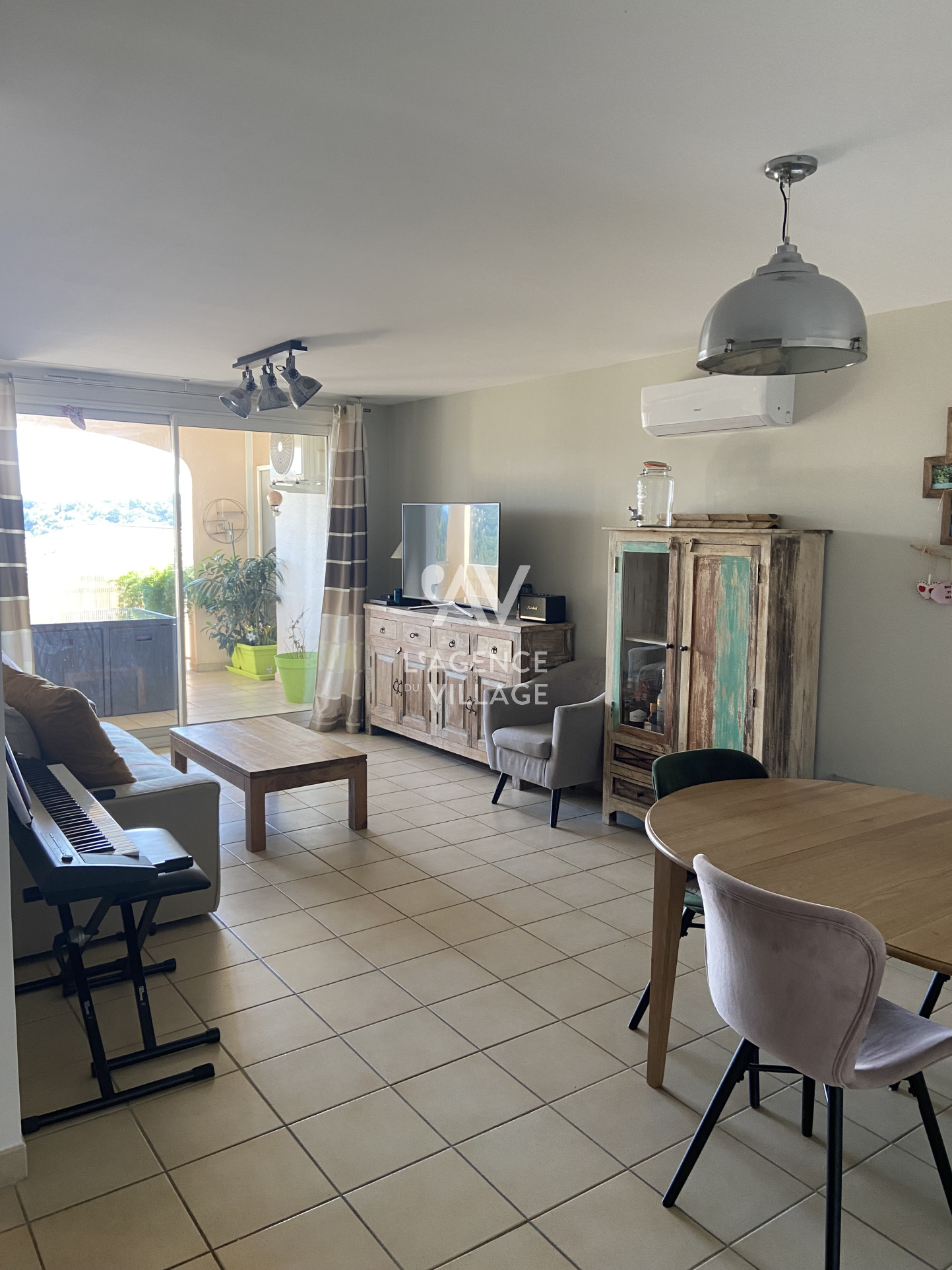 Séjour avec accès à une agréable terrasse de 10m² jouissant d'une magnifique vue sur le village et les collines.