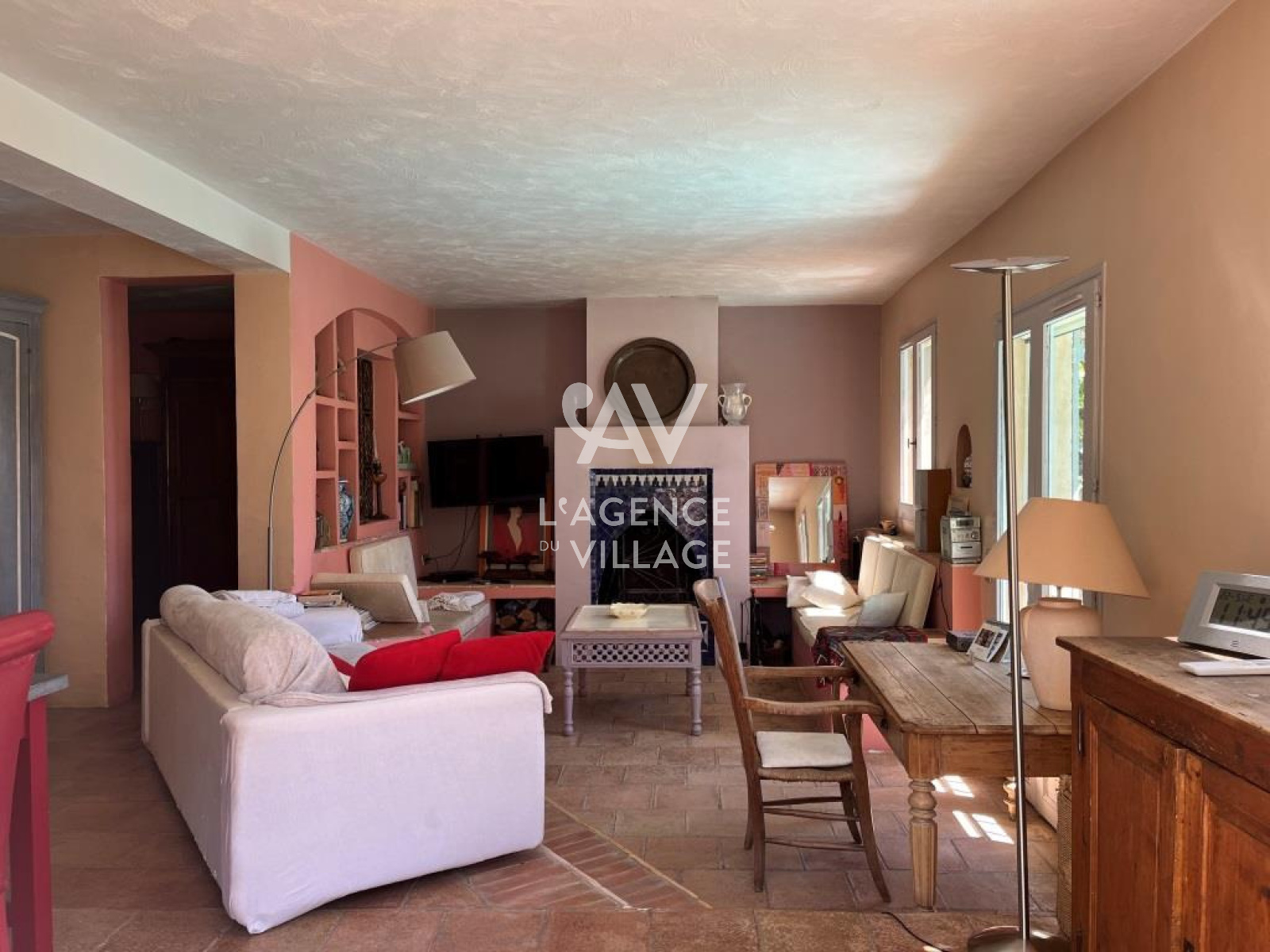 RDC : cuisine américaine, salle à manger, séjour avec cheminée, buanderie et wc.