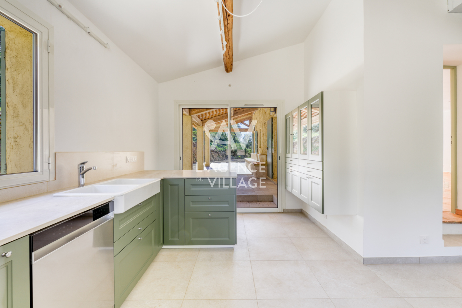 Entrée par un niveau intermédiaire sur le grand séjour lumineux et ouvert sur des terrasses et la colline, cuisine séparée et tout équipée avec également son accès à des terrasses couvertes.